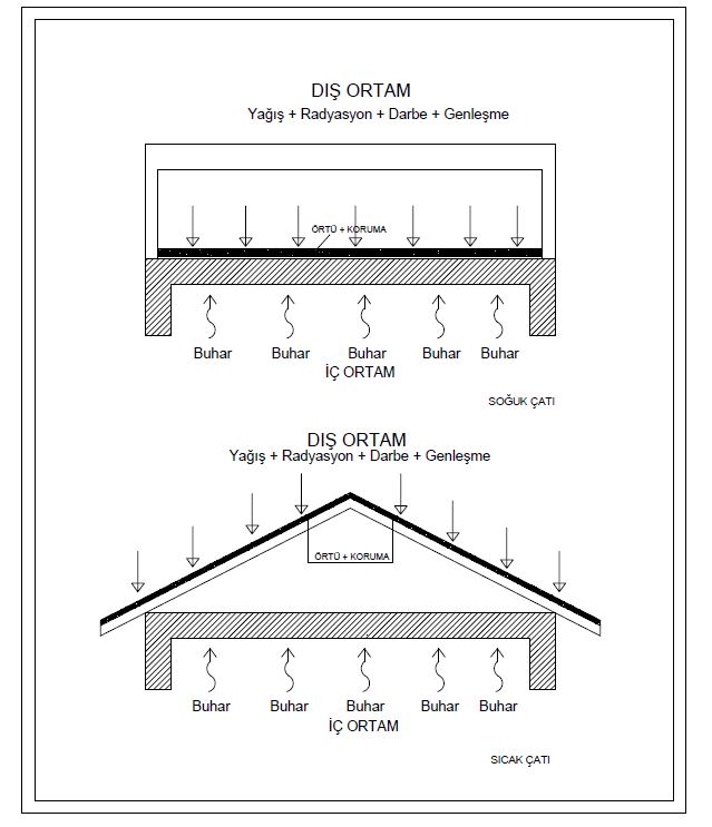 • Soğuk çatıda iç hacimden gelen su buharı döşemeyi he hava yastığını geçerek dış havaya çıkabilir. Sıcak çatıda ise mutlaka havalandırmaya ihtiyaç vardır.