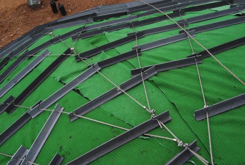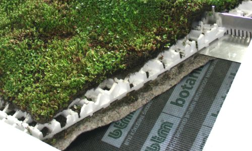 Su ve ısı yalıtımı sağlanmış eğimli betonarme yüzeylerin üzeri ilk olarak spesifik özellikli, suyun akış yönünde kanallı bir yapıya sahip hem koruyucu hem de nem tutucu olan BTM Optigreen SSV 800, 800gr/m2’lik yeşil renkli geotekstil ile kaplanır. Sistemin esas ana bileşenleri olan çelik halatların ankraj noktalarına bağlantıları ve toprak tutucuların tümünün yerleşimi, eğimli alanlarda kaydırmazdık için yüksek teknoloji ile üretilmiş olan bu geotekstil üzerinde gerçekleştirilir.