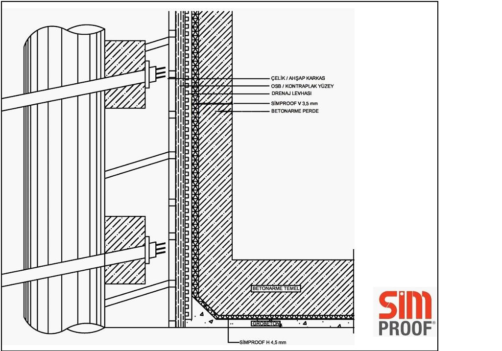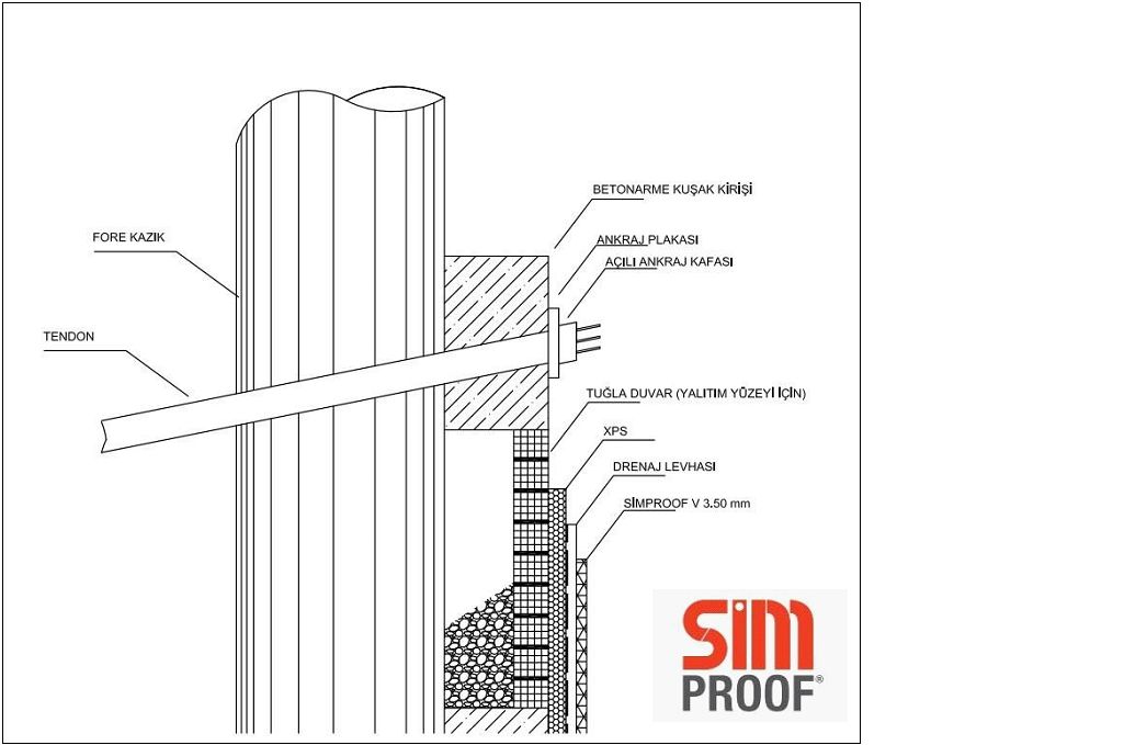 Perde yapısına uygun oluşturulan yalıtım yüzeyi sonrasında, proof imalatından önce sırasıyla xps ve drenaj levhası imalatları bulunmaktadır. XPS imalatının su yalıtımı açısından bir zaruriyeti bulunmamakla birlikte yüklenici tercihine göre kullanımı opsiyoneldir. Xps imalatı sonrasında ise proje kazı derinliğine uygun olarak seçilmiş drenaj levhası imalatı yapılmalıdır. Drenaj levhası imalatında levhalar proof membran imalat kotu boyunca, birbirleri üzerine 20-25 cm bindirilerek ve mekanik sabitleme ile yüzeye tutturulmalıdır. Proof uygulaması yapılırken, şaloma kullanımı sırasında, drenaj levhalarının yanarak deforme olma riskine karşı ek yeri yapıştırma aşamasında gerekli hassasiyetin gösterilmesi ve tedbirlerin alınması gerekmektedir.