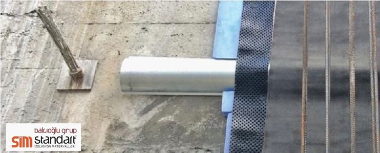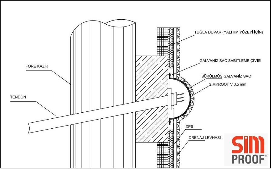 Gerek diyafram duvarlarda gerekse kuşak kirişli iksa imalatlarında, karşımıza çıkan zemin ankraj çubuk başlıkları yalıtımın yapılacağı yüzeyin sağlıklı kalabilmesi açısından oldukça önemlidir. Bu kısımlarda zaman zaman uygulamacılar farklı çözümler üretseler de, eğer ankraj başını geride bırakan, farklı, ikinci bir ön yüzey oluşturmuyorsanız, proof sistem ürünlerini ankraj başlarından zarar görmeyecek şekilde imal etmeniz gerekmektedir. Bunun için de ankraj başlıklarının üzerini hat boyunca takip eden, galvanizden imal edilmiş, mekanik olarak sabitlenebilen, proof imalatına uygun açıya sahip bir kapak yapılmalıdır. Bu galvaniz bükümlü sac kaplama, ankraj başlığını örtecek yarı çapta, beton kütle ağırlığı karşısında bükülmeyecek kesit kalınlığına sahip olmalı ve proof membranın imalat prosedürüne engel olmayacak, risk noktası oluşturmayacak forma sahip olmalıdır.