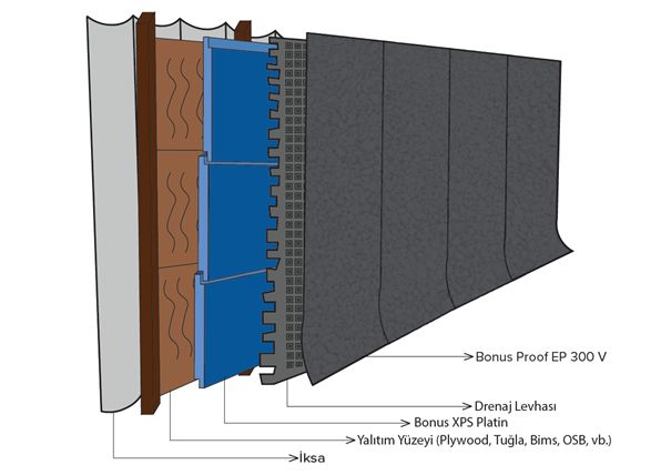 Oluşturulan yüzeyin üzerine BONUS XPS PLUS yerleştirilir ve üzerine uygun drenaj levhası eklenir.