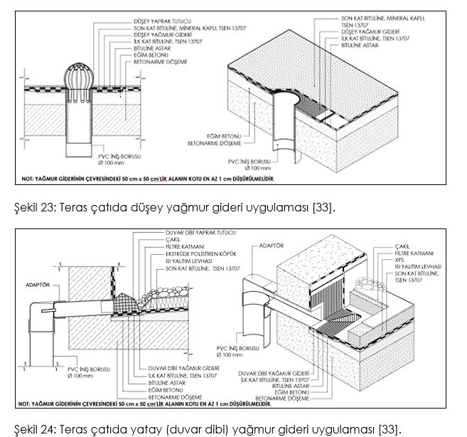 Piyasada 100 m2’lik bir çatı alanı için 1 adet Ø100 mm’lik gider konulması gerektiği gibi yanlış bir algı vardır. Halbuki her 1 m2 çatı alanı için en az 1cm2 yağmur gideri alanı gereklidir. Terasa bitişik bir duvar varsa, bu duvar alanının %50’si de teras alanına ilave edilerek hesap yapılmalıdır. Ayrıca modifiye bitümlü yalıtım membranının uygulama sırasında yağmur giderinin içine çevrileceği ve gider kesitini küçülteceği de dikkate alınmalıdır. Buna göre etrafı tamamen açık 70 m2’lik bir terasta en az 1 adet Ø100 mm’lik yağmur gideri kullanılmalıdır.