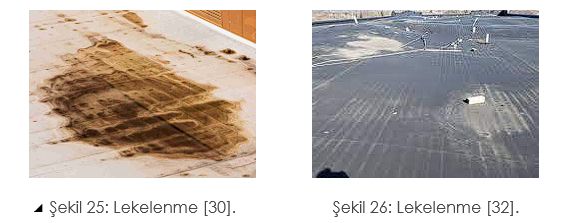 Su birikmesi teras çatılarda koyu lekelere neden olabilir. Bu da altındaki modifiye bitümlü membranın performasında düşüşler olabileceğinin işaretidir.