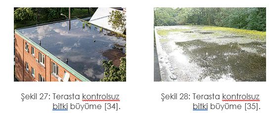 - Rüzgarlarla çatı üzerine taşınan toz-toprak temizlenmeli ve çatıda kontrolsüz bitki büyümesi engellenmelidir.