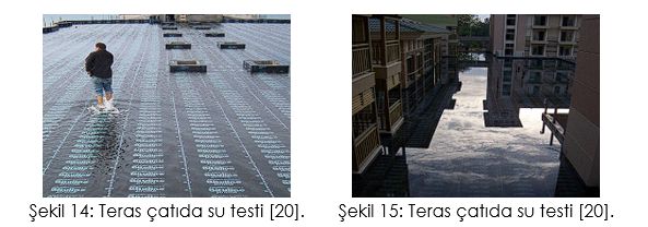 Uygulama tamamlandıktan sonra su testi yapılmalı ve gezilebilen çatılarda (üzerine farklı malzeme kaplanacak olan) membranların su sızdırmadığından %100 emin olduktan sonra üzeri kapatılmalıdır [20].