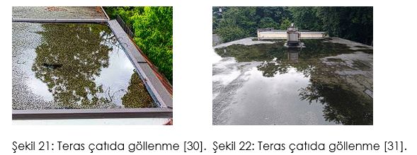 Şiddetli bir yağmurdan sonra 12-36 saat boyunca teras çatıda duran su normal kabul edilir ancak, teras çatılarda 2 tam günden daha uzun süre göllenen herhangi bir su, mutlaka bir uzman tarafından incelenmelidir [22, 23]. Mimar veya inşaat mühendisleri çatıyı sistemik bir bakış açısıyla inceleyebilir ve çatıda su birikmesini önlemek için ne gibi önlemler alınması gerektiğini belirler.